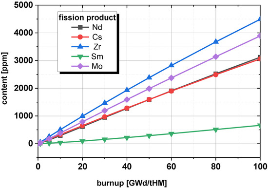 For the full investigation of fission product accumulation, the 142 isotopes of the highest concentration were evaluated from the POLARIS calculation as tested in [26]. The accumulation of these isotopes was analysed in detail and the leading isotopes of up to 37 elements have been considered.