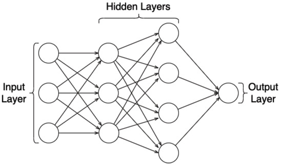 An MLP is represented in Figure 1. An MLP must have at least three layers, composed of at least one input layer, hidden layer, and output layer to be considered a deep learning architecture. The MLP used in this work consists of an input layer, two hidden layers, and an output layer, as illustrated in Figure 1.