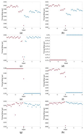 To analyze the timing attack, we replicated the timing attack. We used the Arduino Uno simulator [23] to recreate the timing behavior, as shown in Figure 2a,c,d. We also performed the timing attack on similar activation functions, shown in Figure 2b,e–h. The timing delay is displayed in μs. The experiments were performed using an Arduino Uno simulator and Tinkercad Circuits without the use of physical hardware [23]. By using the simulator, we were able to gain more data due to the fast process. The processing times were averaged 10 times per input. We measured the calculation time of the activation functions with a micros function, which returns how many microseconds passed since the Arduino board started processing. Therefore, there is some difference in timing delay to when acquiring with the oscilloscope. However, this is in principle the same as measuring on a real system, as it counts the number of clocks, which is precise enough for our experiment.