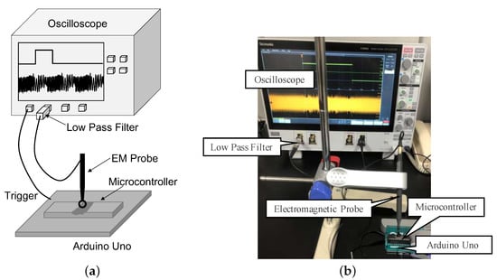 We used the Tektronix MSO64 oscilloscope with an RF-U 5-2 near-field EM probe from Langer to collect EM measurements. All measurements were 500 M samples/s. We also used a low-pass filter BLP-50+ from Mini-Circuits with the cutoff frequency of 48 MHz. We used the filter to obtain a clear signal from the measurements. We decapsulated the microcontroller by scraping the outer package to improve the quality of measurement of the microcontroller [24]. The EM probe was then placed above the decapsulated chip. The full measurement setup is depicted in Figure 3.