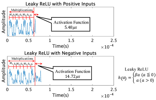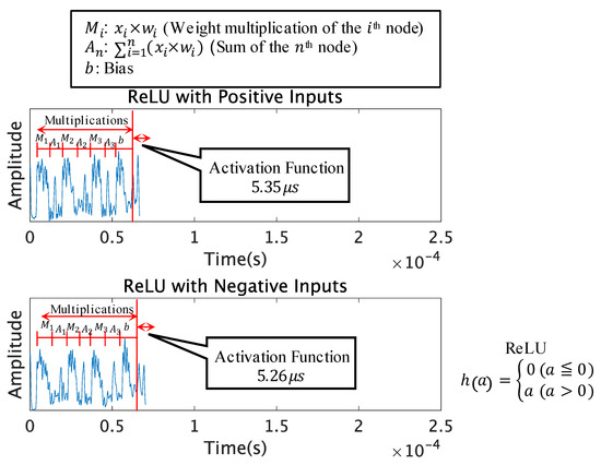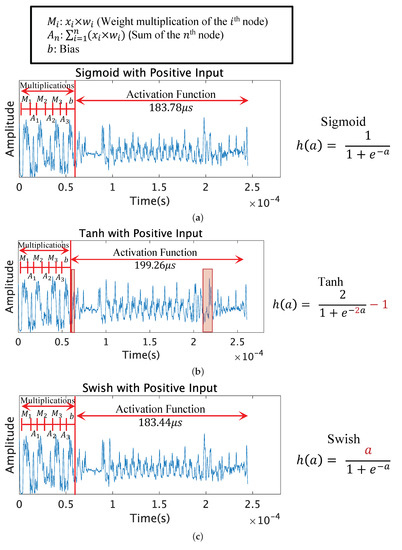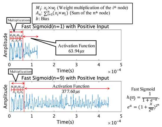 The Fast Sigmoid function includes the exponentiation operation. The approximation of the exponential function has a unique pattern; therefore, it can be easily distinguished from the other functions as shown in Figure 10. When from Equation (9), the peak patterns were very unique and had a shorter computation time than the Sigmoid function. When from Equation (9), the peak patterns were also unique, however having a resemblance to the Sigmoid function in the latter half of the activation function.