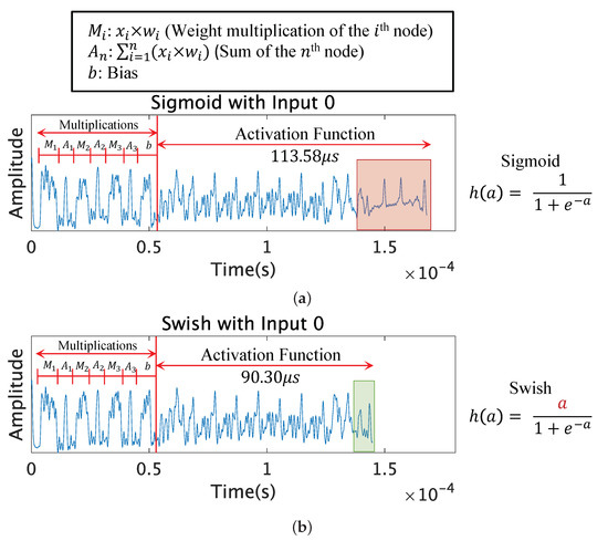 The processed leakage patterns of the Sigmoid and Swish functions with input 0 are shown in Figure 5. When processing input 0, the Swish function has 0 as the numerator, reducing the time for the division operation compared to the Sigmoid function. The division operation for the Sigmoid function is surrounded in a red box, and the division operation for the Swish function is surrounded in a green box. It can be clearly observed that the Swish function is shorter in computation time and also has fewer peaks compared to the Sigmoid function.