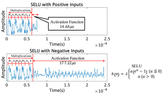 The three functions, ReLU, Leaky ReLU, and SELU, have a similar computation time; however, they have different equations for positive and negative inputs, causing distinct patterns. The timing patterns of these functions are depicted in Figure 2d–f. The ReLU function and Leaky ReLU function are very similar and are a mirror image of each other. The Leaky ReLU function has a independent computation time at input 0; however, this is due to the implementation method. The Leaky ReLU function, i.e., Equation (6), can also be implemented like Equation (10) to blend the computation time of input 0 with the other positive inputs.
