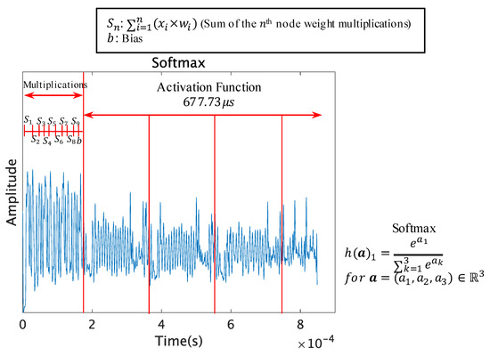 By observing the patterns of the multiplication operation, the weight multiplication, the addition of the outputs, and the addition of the bias can be distinguished from the trace. The multiplication operation is a repeating pattern before the activation function. The activation function can be observed after the repeating pattern of multiplications, and this signal processing allows the unique patterns in the traces to be visually inspected.