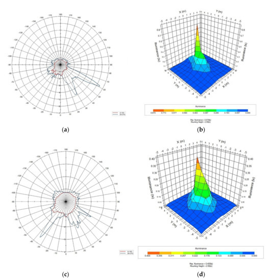 The polar distribution and ISO lux diagrams for the LED lights used for the experiments by integrating the sphere device and goniophotometer system: (a) polar distribution of green LED; (b) ISO lux diagram of green LED; (c) polar distribution of white LED; (d) ISO lux diagram of green LED.