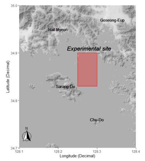 Map of experimental site in the South Sea, Korea. The red rectangle box indicates the area of the fishing grounds for experimental fishing operations.