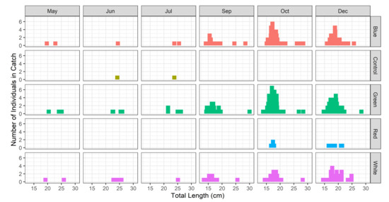 Pot fishing is known to be affected by various conditions from the target fish density to bait type and characteristics, immersion time, fishing season, fishing gear shape, and fishing ground environment [13,42]. The BSR pots, similarly, may capture fish as the artificial light directly affects fish entry, makes it easier for the fish to find the pot entrance, or as the prey organism of the target responds to the light. A study on cod (Gadus morhua) pot fishing in the Atlantic Ocean reported that green LED increased CPUE [27]. However, subsequent studies showed that the cod entered the pot to feed on the moving krill (Thysanoessa inermis) gathered around the LED inside the pot and not because of any direct response to the light [29,41].
