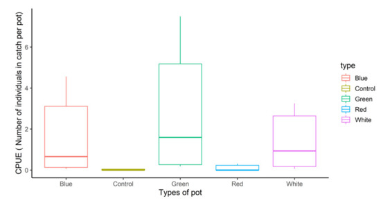 However, compared to gillnet or trawl, pot fishing has a low catch rate. It is, thus, crucial that catch efficiency is improved to ensure profitability for fishery operators [10]. The development of pot fishing techniques has continuously advanced via studies on the reduction in bycatch and the improvement in size selectivity and pot design, as well as in comparing bycatch reductions in pots and other gears [11,12,13,14,15,16]. Recently, studies have been conducted on the application of light-emitting diode (LED) lights to the pot as a novel technique to increase catch rates [17,18].