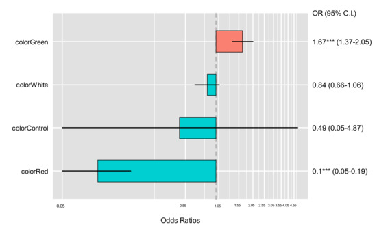 The monthly catch count in accordance with the total length class for the target BSR species between the control and experimental groups during the field experiment period is shown in Figure 4. The monthly catch showed the highest catch frequency in the pots with green, blue, and white LED lights. The catch per unit effort (CPUE) for the BSR pot of the control group was compared according to the BSR catch count per the total use of fishing gear, as shown in Figure 5. CPUE was the highest for the pot with green LED (2.84 ± 3.21; mean ± standard deviation, hereafter), followed by blue LED (1.64 ± 3.21), white LED (1.39 ± 1.46), and red LED (0.02 ± 0.03). For BSR catch efficiency, the pots with green and blue LED lights showed the highest levels during the peak fishing season in October and December. The parameter estimates for the GLMM model for the BSR CPUE are shown in Table 3. The effect of treatment on CPUE was visualized using odds ratio plot in Figure 6.