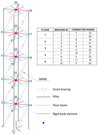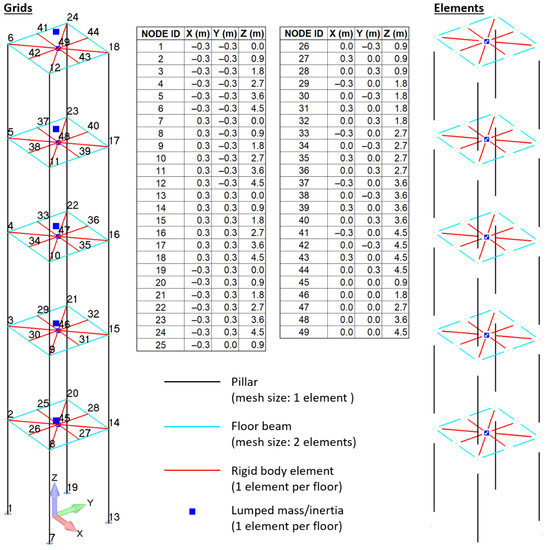 Linear bar elements were used for the mesh of the pillars (one single element per structural item) and horizontal beams (two elements per structural item), while each floor was modeled as a rigid body. To implement the rigid-body condition, auxiliary nodes were generated at the center of each floor and were then rigidly connected to all the nodes of the horizontal beams that support the floor; in these rigid connections, the degrees of freedom of the floor-beam grids were slaved to those of the auxiliary nodes at the center of the floors.