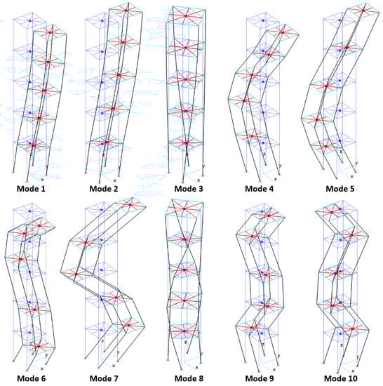 Only the first six modes that were characterized by displacements along the direction of excitation (Modes 2,3,5,7,8,10) were taken into account since the residual inertia associated with all the remaining modes was equal to only 2% of the overall inertia that was exhibited by the structure when moving along the y-axis. The definition of “residual inertia” and the explanation of its link to the number of selected modes are given in Appendix A.