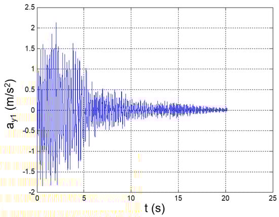 The structure considered was subjected to a monodirectional seismic acceleration (aY) along the Y-axis of the reference system that is reported in Figure 1. The time history of the ay was taken from [22], which refers to the earthquake accelerograms that are compliant with Eurocode 8 [23], and which are related to Zone 3, Ground Type A, and a peak ground acceleration (PGA) equal to 1.23 m/s2 (Figure 2, left side). The zone’s category, ground type, and PGA were selected by considering the recent earthquake history and the typical geological characteristics of the seismic regions in Southern Italy. To coherently apply the real earthquake accelerogram to the scaled structure, the acceleration time history was adjusted by scaling the time vector by the factor (); the scaled time history of the seismic acceleration is reported on the right side of Figure 2 and is hereafter referred to as the “seismic excitation” (ay(t)).