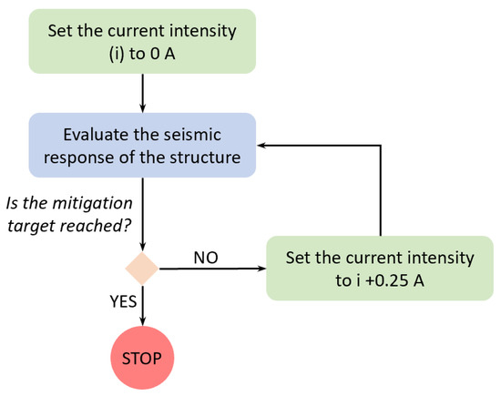 The characteristic damping curves of the selected device (damping force versus piston speed), which are experimentally determined by the manufacturer, are used to feed an iterative process for predicting the seismic response of the structure in correspondence with different activation levels of the MRDs. At the end of the process, the minimum activation current is determined in compliance with the vibration-suppression targets that are assumed for the seismic protection system.