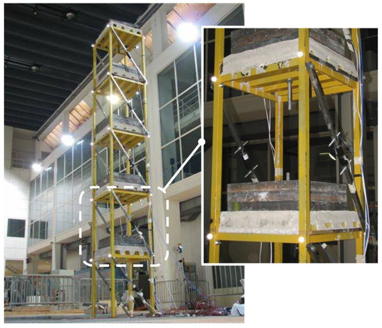A slender metallic truss was selected as a reference structure for the numerical and experimental activities that are addressed in this study. The truss is dynamically representative of a five-story ultra-high-rise building, according to a geometrical scale factor of l = 4. The planform of the truss is square, with a side length of 640 cm, while each story is 900 cm in height (Figure 1). The pillars and floor beams are made of FE340 and are characterized by rectangular box sections with a 2 mm thickness and width x height dimensions of 40 mm × 40 mm and 40 mm × 20 mm, respectively. Each floor consists of a corrugated steel sheet with a reinforced concrete slab surmounted by steel blocks to achieve the global inertial characteristics, which are recapped in Table 1.