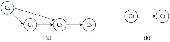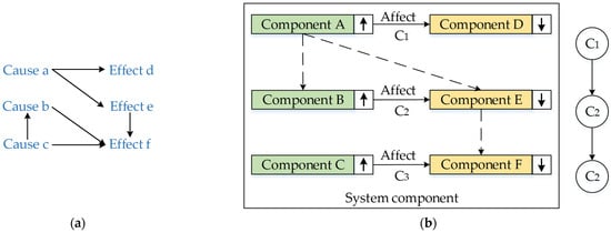 - Simple problem area: The cause-effect relationship in this area is a one-to-one correspondence, as shown in Figure 2a. The relation from analogy to conflict is shown in the improvement of each component with problems of other components, but there is no mutual influence between improved and affected components. Extracted conflicts are independent, as shown in Figure 2b, where C1 and C2 represent conflicts.