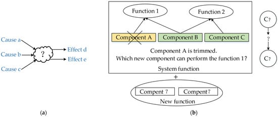 - Complex problem area: A cause-effect relationship exists, but it can only be established after the initial exploration of the incomplete solution is formed, as shown in Figure 4a. The analogy to conflict manifests itself as the addition of a known new function to the current system or the adoption of other resources within or outside the system to implement the current system function by trimming components of the system. Since the working principle of the newly added function or the function where the trimming component is located has not been determined, the component that implements the principle cannot be identified and the conflict cannot be extracted. The conflict can be extracted after a tentative solution is found for a preliminary solution. The problem in this area is to attach new known functions or trimming, as shown in Figure 4b.