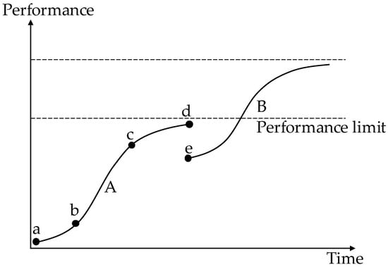 A product technology life cycle curve is shown in Figure 7. The existing technology life cycle curve A of the product will rise with the technology’s performance until it reaches the technology performance limit, point d. After that, it will enter the performance decline period, new alternative technologies will appear (e.g., B), and existing technologies will be withdrawn from the market. The evolutionary process of the technology possessed by the current product from point a to point d and the jump from point d to point e is uncertain. There is no way to determine how far the product will evolve next or which evolutionary curve it will jump to. However, for sustainable development, the product must take timely measures to prevent being eliminated from the market. The chaotic problem area coincides with this feature, problems in this area are solved by combining the technological evolution as follows.