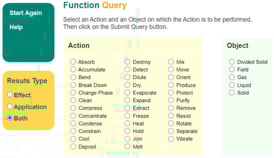 The technology system is either to add new functions from the technology evolution of the chaotic area or from customer requirements, or to replace working principle of original functions by trimming. Since the working principle of the function, implementation has not been determined and corresponding components have not been identified, it is an uncertain technology system where conflicts cannot be extracted directly. Therefore, a conversion of the uncertain technology system to a definite technology system is required. To increase the diversity and innovativeness of the solutions, an online effect database created by Oxford [] is used to search emerge several solutions in this field and across fields. The optimal solution can then be selected as the initial original understanding through solution screening. An uncertain technical system is then converted to a definite technical system and the problem is converted from a complex problem area to a complicated or simple problem area.