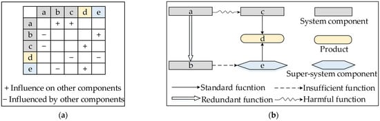 (a) Interaction matrix of system components, products, and super-system components; (b) Function model.