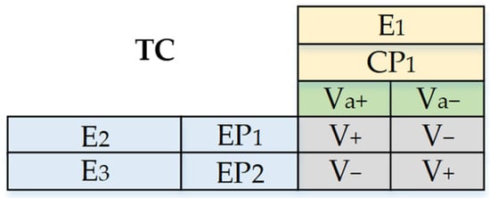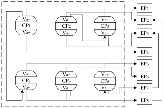 Where, E1, E2, E3 are system elements; CP1 is the control parameter, a yellow area in the figure; EPi is the evaluation parameter, blue area in the figure; Va+ and Va− denote positive and negative values of control parameters, green area in the figure; V+ and V− are positive and negative values of evaluation parameters, grey area in the figure.