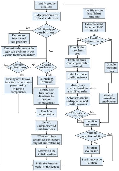 The analysis of problems under external environment changes is a dynamic and uncertain decision-making process. Existing applications of the Cynefin framework are only for identifying problems. That is insufficient to classify problems encountered in the process of product innovation and transform the problem into the solution area. It is noted that the framework can be redefined by users to support decision-making based on specific scenarios [,]. Therefore, this paper combines the Cynefin framework with conflict-solving tools of TRIZ and Ashby’s law [] to reconfigure the existing Cynefin framework as an effective tool for problem-solving of product innovation.