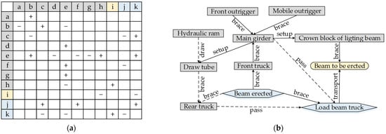 A complicated or simple problem area is a definite technical system where conflicts can be extracted directly. First, interactions between system components, products, and super-system components are identified to construct an interaction matrix as shown in Figure 10a, where + indicates that the element acts on other elements, − shows that the element is acted by other elements. Then, a function model [] of the technical system is created based on the interaction matrix as shown in Figure 10b. Insufficient, redundant, and harmful functions. Deficient functions in the function model are then analyzed to identify associated components for the conflict extraction.