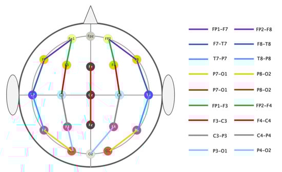 For the purpose of verifying the effectiveness of the proposed model, we conducted corresponding tests on the CHB-MIT dataset. In the experiment, the interictal phase was defined as the period 4 h before the seizure and 4 h after the end of the seizure. The division of epileptic EEG signals is shown in Figure 3. According to the annotation file for the database, in 24 cases some EEG recording electrodes added or deleted EEG channels during the measurement process. Therefore, we selected the EEG data from the following 18 electrodes that were considered in most cases for analysis: FP1–F7, F7–T7, T7–P7, P7–O1, FP1–F3, F3–C3, C3–P3, P3–O1, FP2–F4, F4–C4, C4–P4, P4–O2, FP2–F8, F8–T8, T8–P8, P8–O2, FZ–CZ, and CZ–PZ. The letter notations are as follows: FP, frontopolar; F, frontal; T, temporal; O, occipital; C, central; P, parietal (Figure 4). In addition, because the channels for cases 12 and 13 changed frequently during the recording process, the EEG recordings may have been polluted, and case 24 had frequent seizures, so we did not have enough interictal data for training. Therefore, in the experiment, we removed the EEG data for these three cases and applied the data for the remaining 21 patients to evaluate our model.