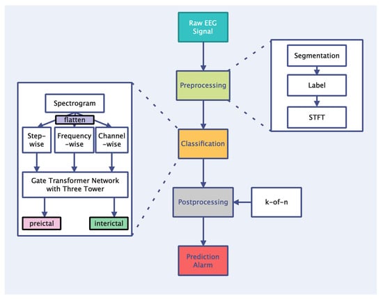 The workflow of the seizure prediction system is shown in Figure 5. First, the EEG signals in the preictal and interictal segments were extracted and labeled. Second, overlapping sliding windows were used to balance the number of EEG segments in each patient’s preictal and interictal segments. Third, the time-frequency domain characteristic information from the above EEG segments was extracted by STFT to obtain the three-dimensional spectrogram matrixes. The number of preictal and interictal spectrograms is summarized in Table 2. Fourth, the feature matrix was inputted to the transformer network model with a three-tower structure. The characteristics of epileptic EEG signals are learned from the step-wise, frequency-wise, and channel-wise encoders, and the classification of EEG signals is realized through the gating mechanism. Finally, the seizure prediction task is finished after post-processing.