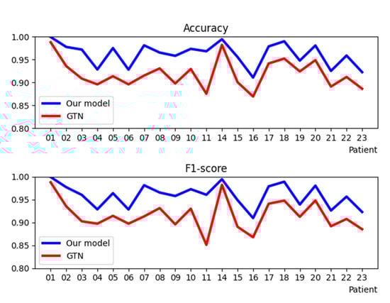 In Table 3, we compare the sensitivity, specificity, and precision of our model with GTN. It can be seen that for all patients, the average sensitivity and specificity of our model were 96.01% and 96.23%, respectively, which were significantly higher than the corresponding values of 92.11% and 91.72% for the GTN model. This indicates that our model achieved satisfactory results in the classification of both preictal and interictal states. Compared with the GTN model, the average precision of our method improved from 91.12% to 95.86%. Figure 6 shows a comparison of the classification accuracy and F1 score for each patient between the GTN model and our model. It can be seen that our model was greatly improved in accuracy and F1 score. The results show that the proposed model improves the utilization of temporal, spectral, and spatial information of EEG signals, and has a better effect on the classification of epileptic EEG signals.