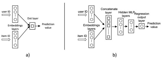 MF models generate hidden factors for both users and items. Hidden factors can be considered as embedding representations. The rating prediction of each item to each user is obtained by just making the dot product of both (user and item) embeddings. MF models are not specifically designed to plot visual representations, but their embedding values can be processed to provide recommendation explanations [12] and to draw relationships [13]. Currently, MF models are being replaced by neural networks (NN) approaches, and consequently, hidden factors are replaced by neural embedding layers. The most relevant NN models in the CF area are DeepMF [14] and Neural Collaborative Filtering (NCF) [15]. DeepMF makes a deep learning implementation of the MF model; thus, it contains a user embedding layer, an item embedding layer, and a ‘Dot’ layer to join the preceding embeddings. NCF replaces the DeepMF ‘Dot’ layer with an MLP and eventually combines deep and shallow learning.