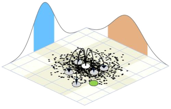 Representation of the variational method, where each sample embedding (white circle) is probabilistically placed (grey circles) at a nearby position (green circle).