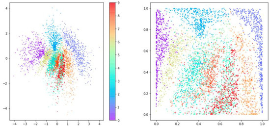 Representation of a VAE latent space for the MNIST dataset (left side) and its cumulative normal distribution (right side).