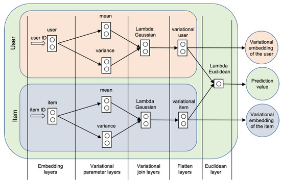 From the explained research, this paper proposes an innovative deep learning model that incorporates two embedding layers: one for code users and the other for code items. Both embeddings will have small sizes to make it possible to draw bi- or three-dimensional graphs of user and item samples. The accuracy loss caused by the small embedding sizes (two or three neurons each embedding) will be tested in the paper. The proposed model also incorporates a variational stage, designed to spread the latent space where item and user embeddings are represented. Both user and item embeddings will be followed by their own Gaussian variational layers whose parameter values are learned in the whole neural model. The expected results are accurate low-dimensional item and user graphs, where samples are spread in a latent space area and not ‘compressed’ in a reduced space region, making it easier to discriminate between adjacent samples. Finally, a ‘Lambda’ join layer is added to the model to implement the Euclidean distance between the embeddings of the items and the embeddings of the users. This layer replaces the ‘Dot’ product layer of the traditional DeepMF model or the MLP stage of the NCF model. The Euclidean Lambda layer’s purpose is to keep near to related user or item embeddings and to keep far from nonrelated user or item embeddings, such as humans intuitively understand distances.