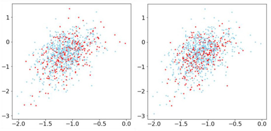 As an example of the proposed model application, Figure 6 shows some demographic information from MovieLens 100K. Both graphs in Figure 6 show the location of the users. The graph on the left plots gender information: female (red) versus male (blue). The right graph plots age information: over 40 years of age (red) versus younger users (blue). Please note that the user plot in the bottom left graph of Figure 5 (MovieLens 100K) is not the same as the shapes shown in Figure 6; this is because they belong to different model trainings. Figure 6 is just an example that shows some type of demographic information: male versus female, and younger versus older users. Similar graphs can be obtained from different demographic features of users and from the item’s type: zip code, incomings, educational level, genre of movies, type of music, year of book publication, etc. Figure 6 shows that there is not a clear pattern to cluster users attending to their gender or age; that is, in the MovieLens 100K dataset, males and females rate movies in a similar way, analogously to the younger and older user case. What is relevant here is that we can obtain representative two and three-dimension representative graphs showing the location of CF demographic features. This big data visual information can be useful to take commercial decisions, implement segmented marketing, understand business data, improve RS information, balance data, correct biased datasets, etc.
