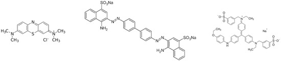 Methylene blue (C16H18ClN3S·3H2O), brilliant blue (C45H44N3NaO7S2) and congo red (C32H22N6Na2O6S2) were purchased from Sigma Aldrich (Gillingham, UK). The chemical structures are shown in Figure 1. Different stock solutions were prepared from a 1000 mg L−1 stock solution. Solutions for calibration curves were created by diluting the stock solution (0–312.5 mg L−1).