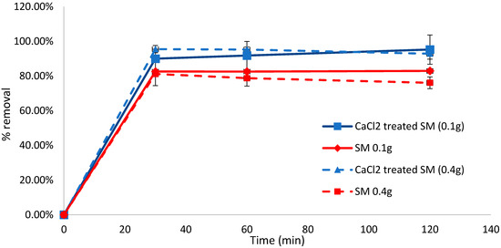 Biosorption of methylene blue over 120 min using CaCl2-pretreated or untreated Sargassum muticum (SM) (0.1 and 0.4 g). Standard deviation n = 3.
