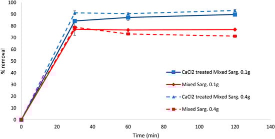 Biosorption of methylene blue over 120 min using CaCl2-pretreated or untreated mixed Sargassum biomass (0.1 and 0.4 g). Standard deviation n = 3.