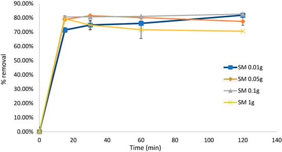 Biosorption of methylene blue over 120 min using Sargassum muticum (SM) at different concentrations. Concentration of dye remained constant at 10 mg L−1 (80 mL). Standard deviation n = 3.