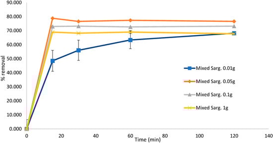 To test the effect of the biosorbent dose on the biosorption efficiency, the experiment for untreated S. muticum was repeated, confirming that a higher biosorbent dose resulted in significant desorption of the dye solution after 120 min. This experiment also confirmed that biosorption occurred within the initial 15 min of contact (Figure 4) and that Sargassum biomass as low as 0.05 g was equally efficient in removing MB in the initial 15 min compared to higher dosages and down to 0.01 g if left for longer than 120 min. Similar results were obtained with the mixed Sargassum biomass (Figure 5) with 0.05 g biosorbent in 10 mg L−1 (80 mL) of dye, indicating optimal conditions.
