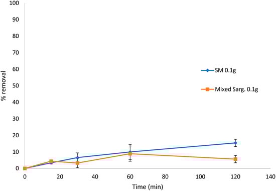 Biosorption of congo red over 120 min by Sargassum muticum (SM) and mixed Sargassum spp. in 0.1 g and 10 mg L−1 (80 mL) dye solution. Standard deviation n = 3.