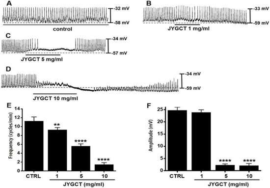 Effect of JYGCT on the pacemaker potential in the ICC. (A–D) JYGCT inhibited the pacemaker potential; (E,F) Summary of the inhibitory frequency and amplitude effects of JYGCT on the pacemaker potential in the ICC. Bars represents the mean ± SE. ** p < 0.01. **** p < 0.0001. JYGCT: Jakyakgamcho-tang; CTRL: control.