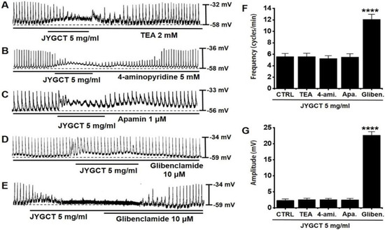 To investigate the involvement of the K+ channels, we used several K+ channel blockers. In the presence of TEA, JYGCT inhibited the pacemaker potential in the ICC (Figure 2A). In addition, JYGCT inhibited the pacemaker potential when co-treated with 4-aminopyridine or apamin (Figure 2B,C). Moreover, glibenclamide (an ATP-sensitive K+ (KATP) channel blocker) did not affect the pacemaker potential and, under these conditions, JYGCT also showed no effect on the pacemaker potential (Figure 2D); further, glibenclamide reversed the effects of JYGCT (Figure 2E). In the presence of 5 mg/mL JYGCT, the mean frequency and amplitude were 5.6 ± 0.6 cycles/min and 2.6 ± 0.4 mV for TEA, 5.3 ± 0.5 cycles/min and 2.6 ± 0.4 mV for 4-aminopyridine, 5.5 ± 0.6 cycles/min and 2.5 ± 0.4 mV for apamin, and 12.1 ± 0.9 cycles/min (p < 0.0001) and 22.7 ± 1.0 mV (p < 0.0001) for glibenclamide (Figure 2F,G). These results suggest that JYGCT activates the KATP channels in the ICC.