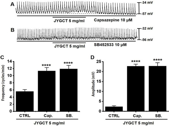 Many studies show that TRPV1 is involved in the physiological functions of the GI tract [19,20,21]; therefore, we investigated the relevance of the TRPV1 channel. We incubated cells with capsazepine or SB452533, a TRPV1 receptor antagonist, for 5 min. Pretreatment with capsazepine or SB452533 blocked the JYGCT-induced effects (Figure 3A,B). The frequency of the pacemaker potential with JYGCT and capsazepine or SB452533 was 11.4 ± 0.9 cycles/min (p < 0.0001) or 11.9 ± 1.0 cycles/min (p < 0.0001), with a corresponding amplitude of 22.7 ± 1.1 mV (p < 0.0001) or 22.8 ± 1.7 mV (p < 0.0001) (Figure 3C,D). Thus, these results suggest that the TRPV1 channels regulate the JYGCT-induced responses.