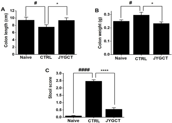 Effects of JYGCT on zymosan-induced colonic changes. (A) Colon length; (B) Colon weight; (C) Stool scores were analyzed. Bars represents the mean ± SE. * p < 0.05. # p < 0.05. #### p < 0.0001. **** p < 0.0001. JYGCT: Jakyakgamcho-tang; CTRL: control.