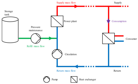 DHNs, as a special form of thermo-hydraulic network, are used to supply customers with energy. The whole system is closed, pressurized, and operated with deionized water (a special, treated form of water) as a medium. Supply pipes and mass flow are drawn in red and return in blue. With a heat exchanger, the consumers obtain the energy from the network. The pressure difference between supply and return drives the mass flow through the heat exchanger, and the supply temperature is reduced to the return temperature. To this end, the network operator has to ensure minimal pressure difference and supply temperature, and the customer has to cool down the medium to a maximal allowed return temperature. The pressure difference is regulated by the circulation pump. If it is too low, the circulation pump power is increased, and if it is too high, pump power is decreased. The pressure maintenance pump ensures a certain pressure level throughout the whole network. At the supply site, the cooled-down medium is heated up again by a heat exchanger. Several heat sources are possible. A power plant is depicted in Figure 1. When transporting the medium from the power plant to the consumer, no medium should be lost in order to ensure an uninterrupted supply. However, leakages can occur within the pipes. In the case of a large, spontaneous leakage, loss of the transport medium can be compensated for a certain period of time. The replenishment is performed via the refill mass flow (green), but the available quantity for this is limited. The refill is necessary to maintain the prevailing pressure in the entire network and to keep the medium liquid.