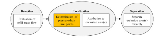 With detection, localization, and separation, Figure 3 shows three very generic but still relevant steps in the case of a large, spontaneous leakage where a network shutdown is imminent. The damaged network part has to be separated as fast as possible to secure network operation. For two of them, there are solutions that have proved themselves in practical operation. Leakage detection has been realized reliably by monitoring the refill mass flow in real time, as described in [7,24]. As shown in Figure 2, fast separation of the damaged network part is possible due to the installed EAs. Hence, the crucial step is the localization of the leakage to separate the right EA from the rest of the network considered here.