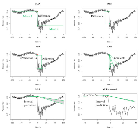 The last self-developed algorithm was the moving linear regression algorithm (MLR algorithm, cp. Figure 4, bottom left) as number five. There were two main factors that influenced this algorithm. One of them was the location of the starting point, and the other one was the scaling factor . The starting point for the algorithm was set to the maximum value in the pressure data because a pressure drop should be detected and not an increase. From the starting point , two more data points, and , were used for starting a moving linear regression with . The permitted prediction interval for was defined by the standard deviation of the used data points for linear regression. The interval was expanded or reduced by the scaling factor to optimize the prediction interval. The point was checked by the following conditions according to Equation (13):