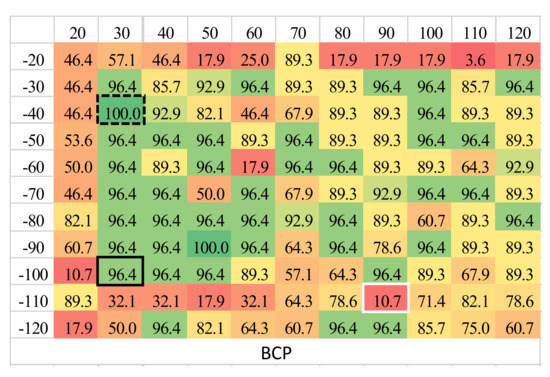 Heat map for the BCP algorithm for event 22 (green—max PC value, red—min PC value). Three PC values are highlighted: best (dashed black rectangle), worst (white rectangle), and the one for best overall evaluation time frame (black rectangle).