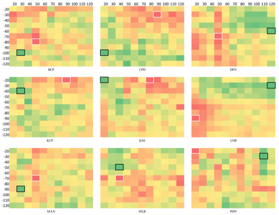 To find the overall best time frame for practical application for all the algorithms, a summary of the 198 (9 algorithms for 22 events) available heat maps was necessary to obtain a meaningful heat map (as in Figure 5) for each algorithm. All 22 heat maps of all the events for one algorithm were summarized. In Figure 6, the summarized PC values for each algorithm for all the events are also shown as a heat map. The heat map illustrates the summarized evaluability of all the events for each algorithm. All nine algorithms are presented row-wise (first row: BCP, CPD, DFN; second row KCP, KSS, LNR; third row MAN, MLR, PDN). The maximum summarized PC value is, again, dark green in a black box within each map. In contrast, the worst PC value is also red in a white box. Hence, the dark green PC value represents the maximum summarized PC value, and the overall best time frame could be determined directly.