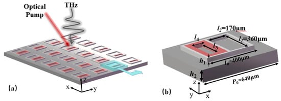 Figure 1a shows a schematic diagram of the proposed THz metastructure. A typical section of the metasurfaces was fabricated on PolyTetraFluoroEthylene (PTFE), and the inset shows the enlarged geometry of the unit cell. A single resonator is 640 × 640 μm, the length and width l0 of the metal-aluminum structure are both 400 μm, and the array size is 400 × 400 μm. There are two rectangular openings on the metal aluminum, and the upper part is a fixed opening with a size of 360 × 170 μm. In order to verify the structural asymmetry, the lower inner boundary is filled with aluminum or photosensitive silicon material with a width of 0–40 μm. As shown in Figure 1b, when red photosensitive silicon with width of 40 μm is introduced into the lower rectangular opening, the internal length and width are l3 = 280 μm and l4 = 90 μm, respectively. Both Si and Al material parameters can be referenced from the Palik Refractive Index database values so that the optical properties of this structure can be simulated and analyzed. In order to excite a significant resonant response, the polarization direction of the incident light must be along the asymmetric axis [24]. The parameters of the materials in the model are shown in the following Table 1.